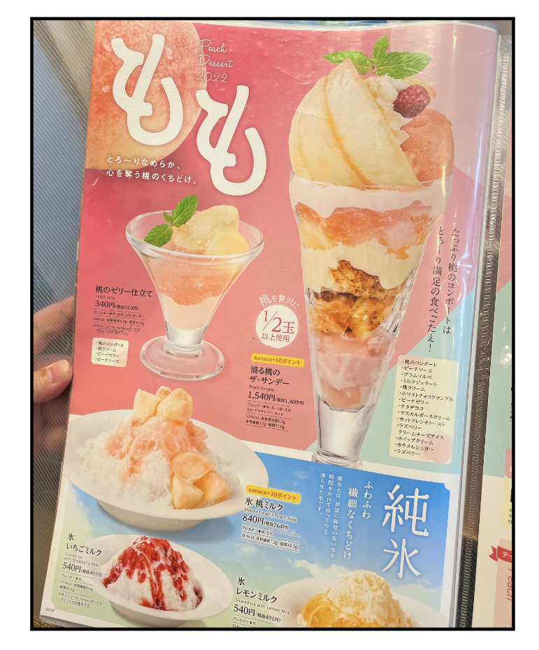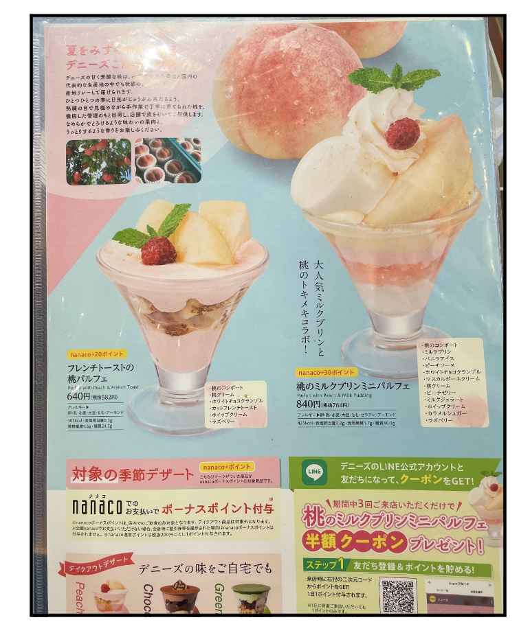 2022年08月21日 魅惑の桃フェア【デニーズ】久しぶりのファミレス クルマの定期点検でディラーへ隣にデニーズがあるからランチをしながら待つことにファミレスに行くのが久しぶりすぎてテンションが上がった驚いたのが最近はタブレットで注文するのね紙のメニューもちゃんと置いてあるよかった私、昔からデニーズのメニューが大好き料理写真も美味しそうだし色も赤味が強くて食欲をそそる(笑)タブレットだとメニューウオッチングがいまいち楽しめないからねさっそく私…デニーズのメニュー・トラップにハマる今日はランチに行ったのに桃フェアにロックオンしちゃった「滴る桃のザ・サンデー」1540円1/2玉以上の桃を使用している桃のパフェ
